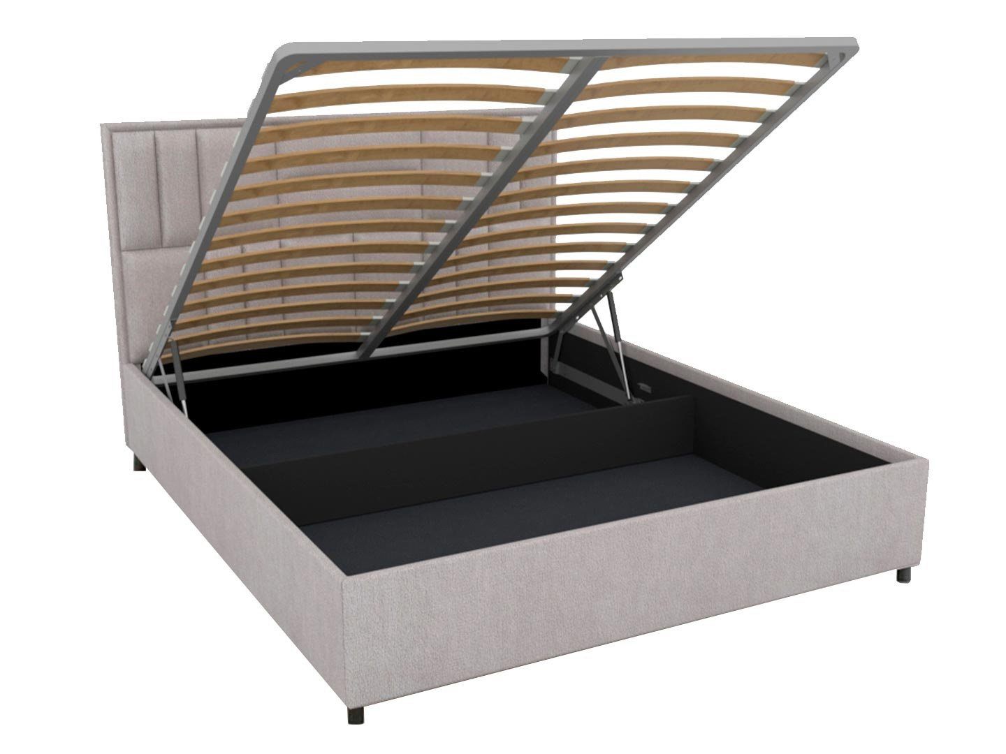 Кровать комплектуется металлическим основанием с подъемным механизмом и ящиком для белья.