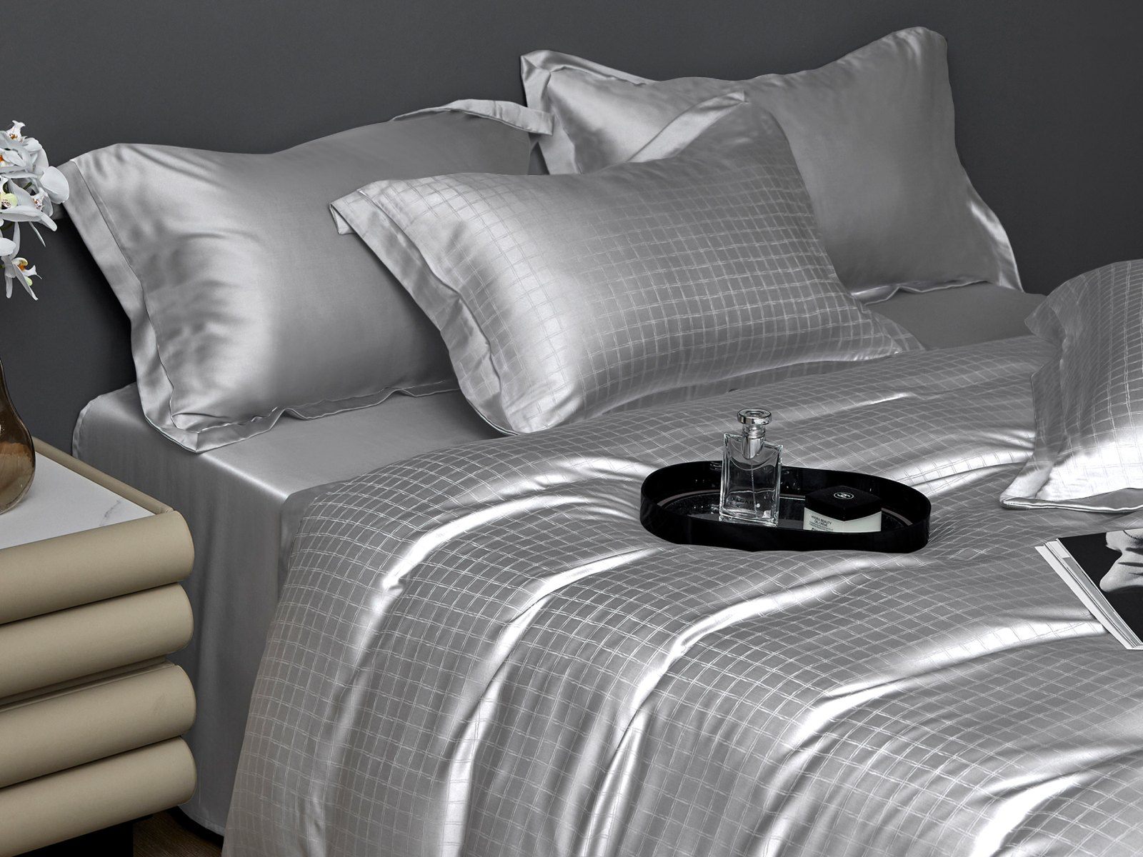 Премиальное постельное белье из жаккардового тенселя дарит истинное блаженство и расслабление. Фактура ткани украшена лаконичный дизайном, созданным путем особого переплетения нитей. Благородная клетка, выполненная в цвете светлого серебра, подчеркивает элегантность тенселя, его шелковые переливы. С постельным бельем из жаккардового тенселя Вы насладитесь не только безупречным качеством , но и получите удовольствие от прикосновения к ткани.