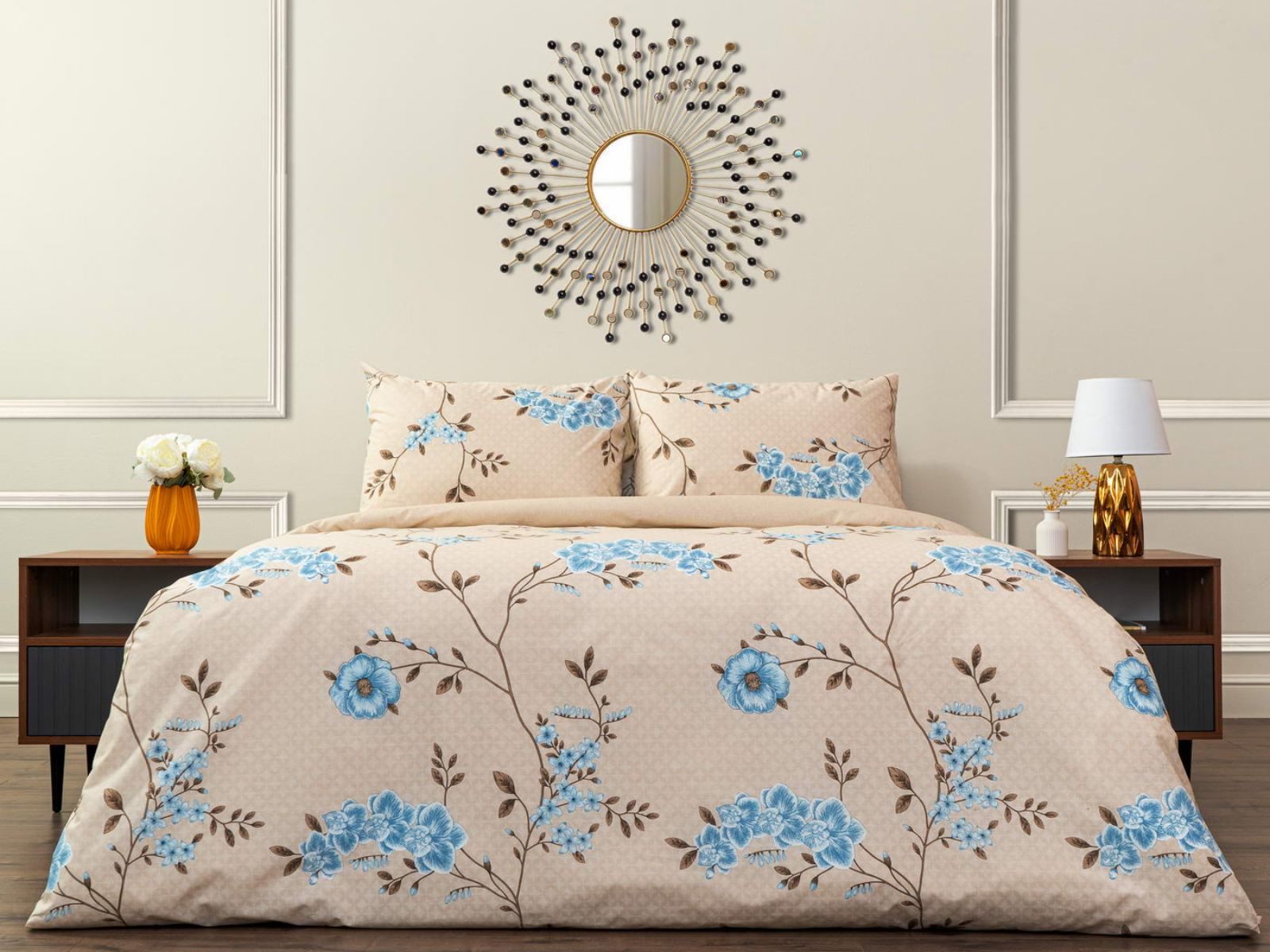 Комплект изготовлен из ранфорса, такая ткань отвечает всем современным стандартам и по уровню комфорта не уступает сатину. Ранфорс долговечен, лёгок и приятен на ощупь.