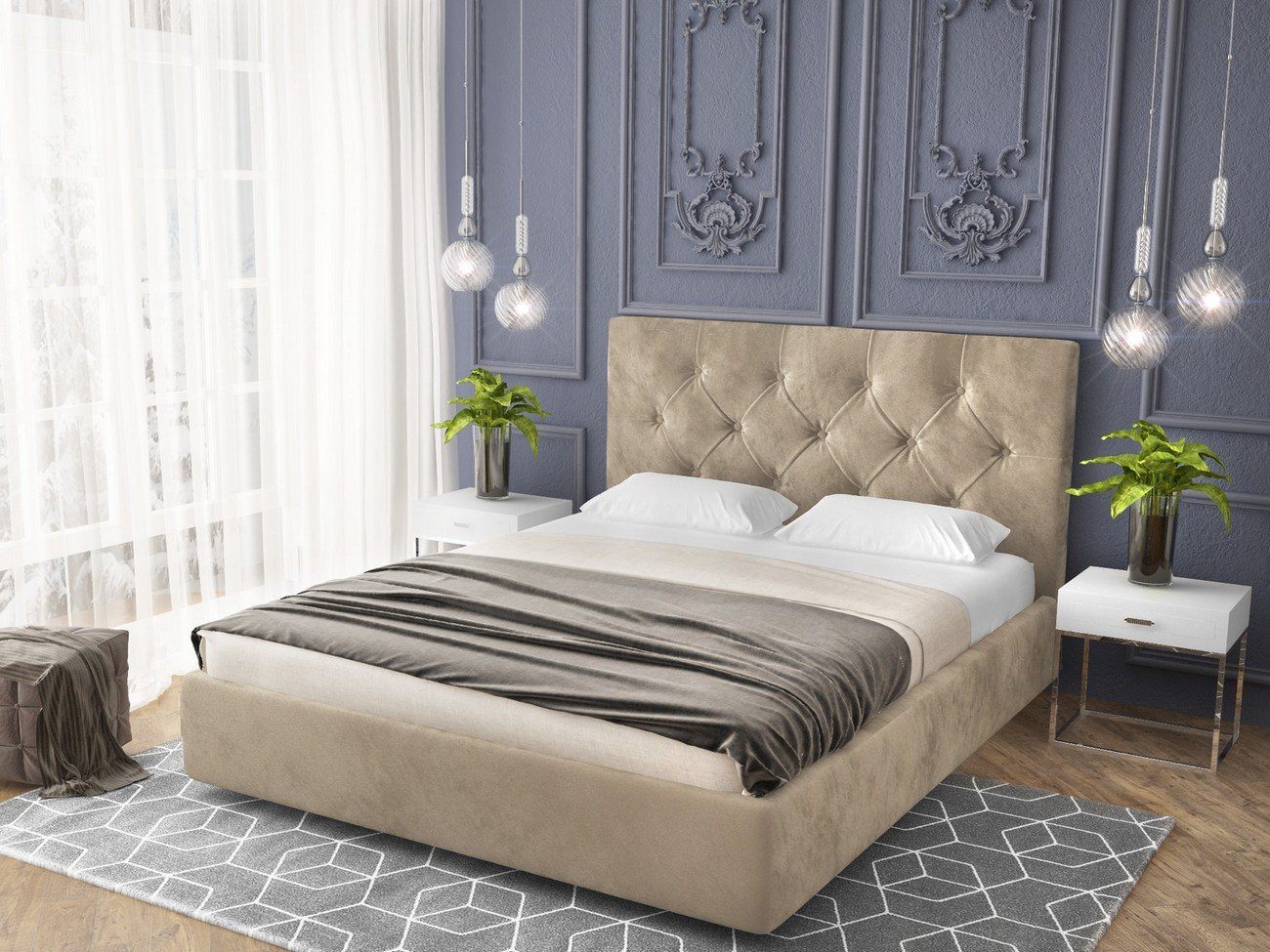 Оригинальная кровать для спальни Sandro Box. Изголовье мягкое, комфортное для отдыха в положении сидя. Геометрический узор спинки придает кровати праздничный и возвышенный вид.