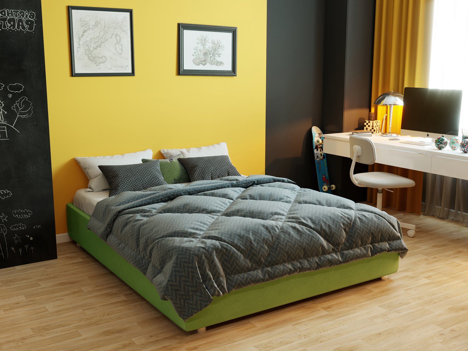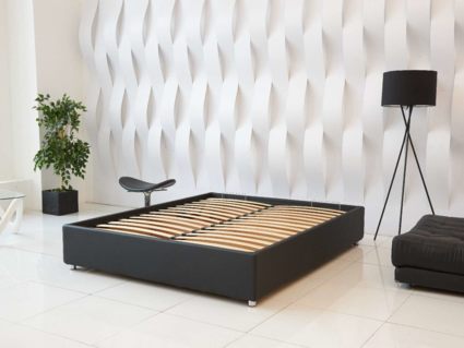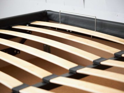 Коробочный каркас кровати собран из ДСП. Это прочный и надёжный материал, который широко используются в мебельной промышленности и органично переносит нагрузки.