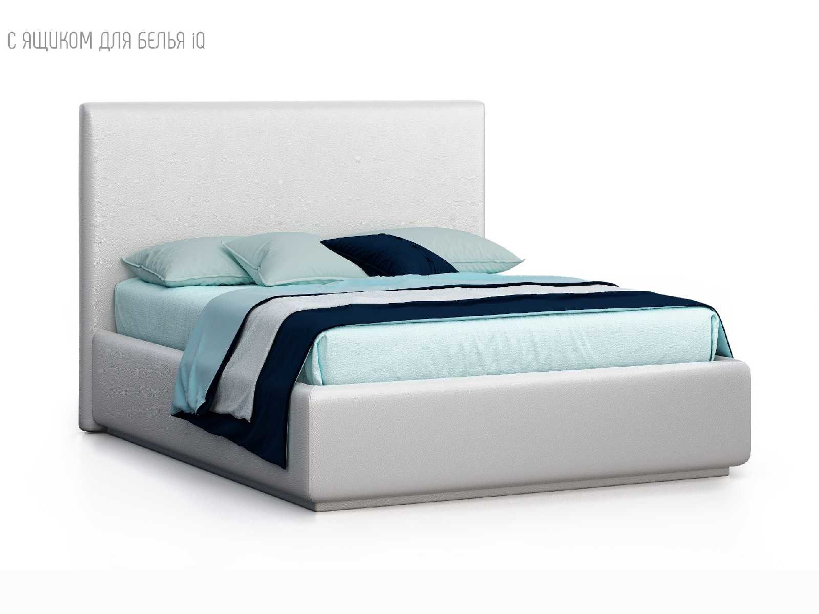 Кровать укомплектована IQ с подъемным механизмом и ящиком для белья без дна (дополнительная платная опция - дно к ящику IQ из HDF (ХДФ). Каркас кровати на цоколе, декоративный чехол на цоколе съёмный. Глубина ящика для белья - 30 см, без ограничения нагрузки на ящик.