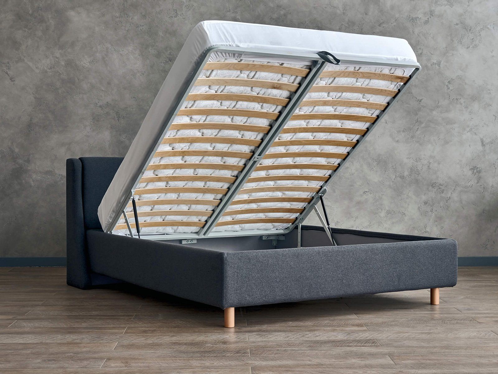 Кровать комплектуется металлическим основанием и подъемным механизмом со вместительным бельевым ящиком. Дно бельевого ящика легко сдвигается для обеспечения уборки под кроватью.