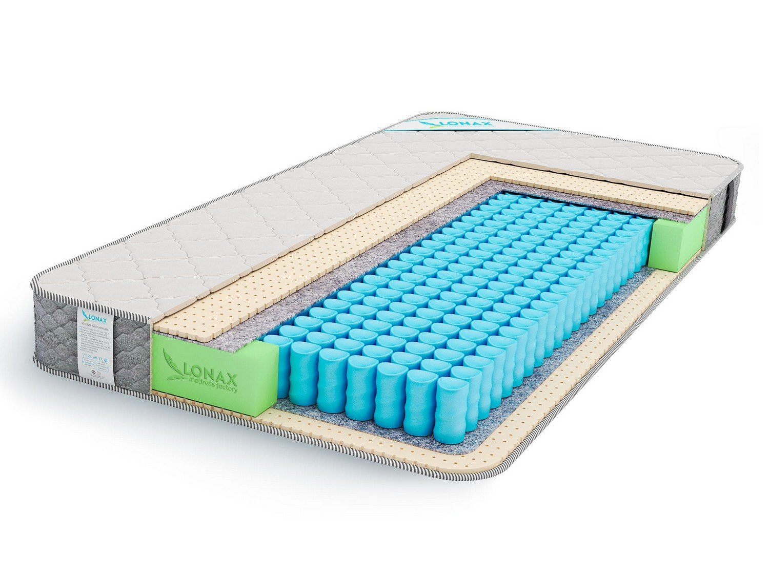 Состоит данная модель из пружинного блока TFK Light (210 независимых пружин на квадратный метр), с обеих сторон от которого расположены слои мягкого и эластичного натурального латекса. Чехол, сшитый из высококачественного трикотажа, отделан серебристо-черным кантом.