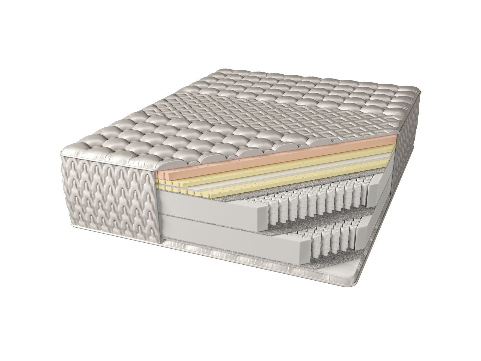 Стеганный чехол матраса и основания из жаккардовой ткани – 55% вискоза, 45% хлопок. Объемный дизайн стежки обеспечивает дополнительный комфорт во время сна. Технология объемной стежки полностью устраняет эффект проваливания, гарантируя спокойный здоровый сон и максимально комфортные ощущения.
