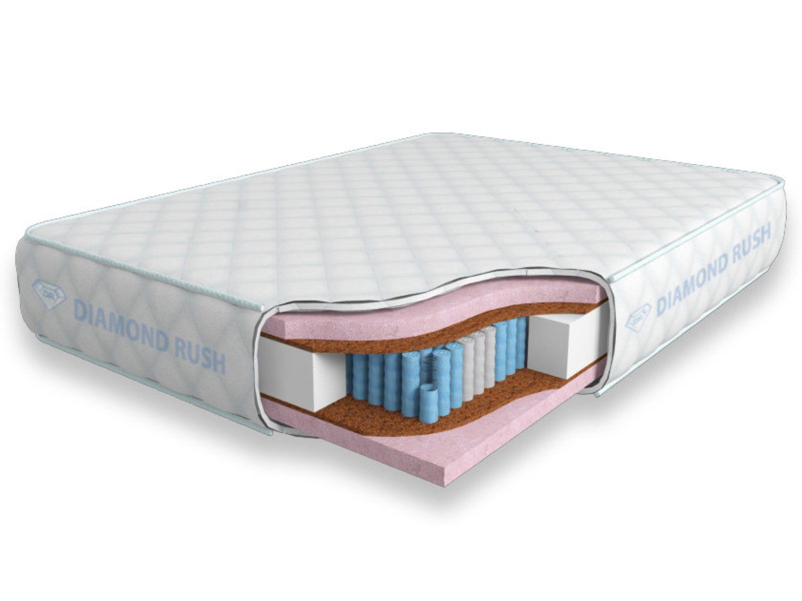 Матрас из серии Luxury Diamond имеет в своей основе независимый пружинный блок MultiZone, состоящий из пружин диаметром 3-4 см разной жесткости. В качестве настилочных слоев поверх пружинного блока используются Меморикс - материал с эффектом памяти, и латексированная кокосовая койра, они образуют среднюю (ближе к мягкой) жесткость.
