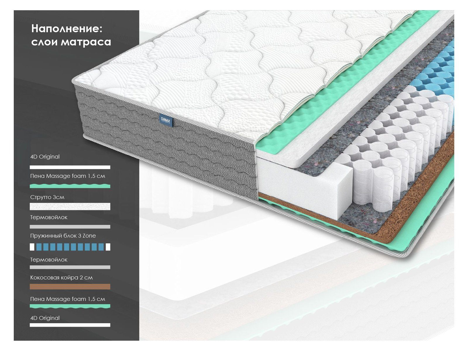 Димакс ОК Струтто Хард Релакс – это пружинный матрас для тех, кто предпочитает выраженную жёсткость спального места, но при этом хочет ощутить деликатный массажный эффект. Модель предлагает две стороны комфорта и базируется на 3-зональном пружинном блоке, который обеспечивает правильное положение для спины.