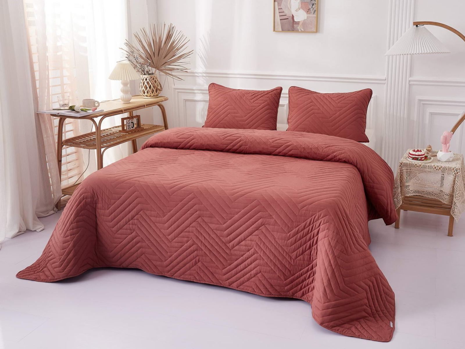 В комплект входят покрывало и одна либо две наволочки (50х70 см) из аналогичного материала в зависимости от размера. Изделия гипоаллергенны, они подходят детям и людям с чувствительной кожей. Покрывала и наволочки не линяют, сохраняют форму и цвет при многочисленных стирках и не выгорают на солнце. Изделия можно стирать в щадящем режиме при температуре не выше 30 градусов.