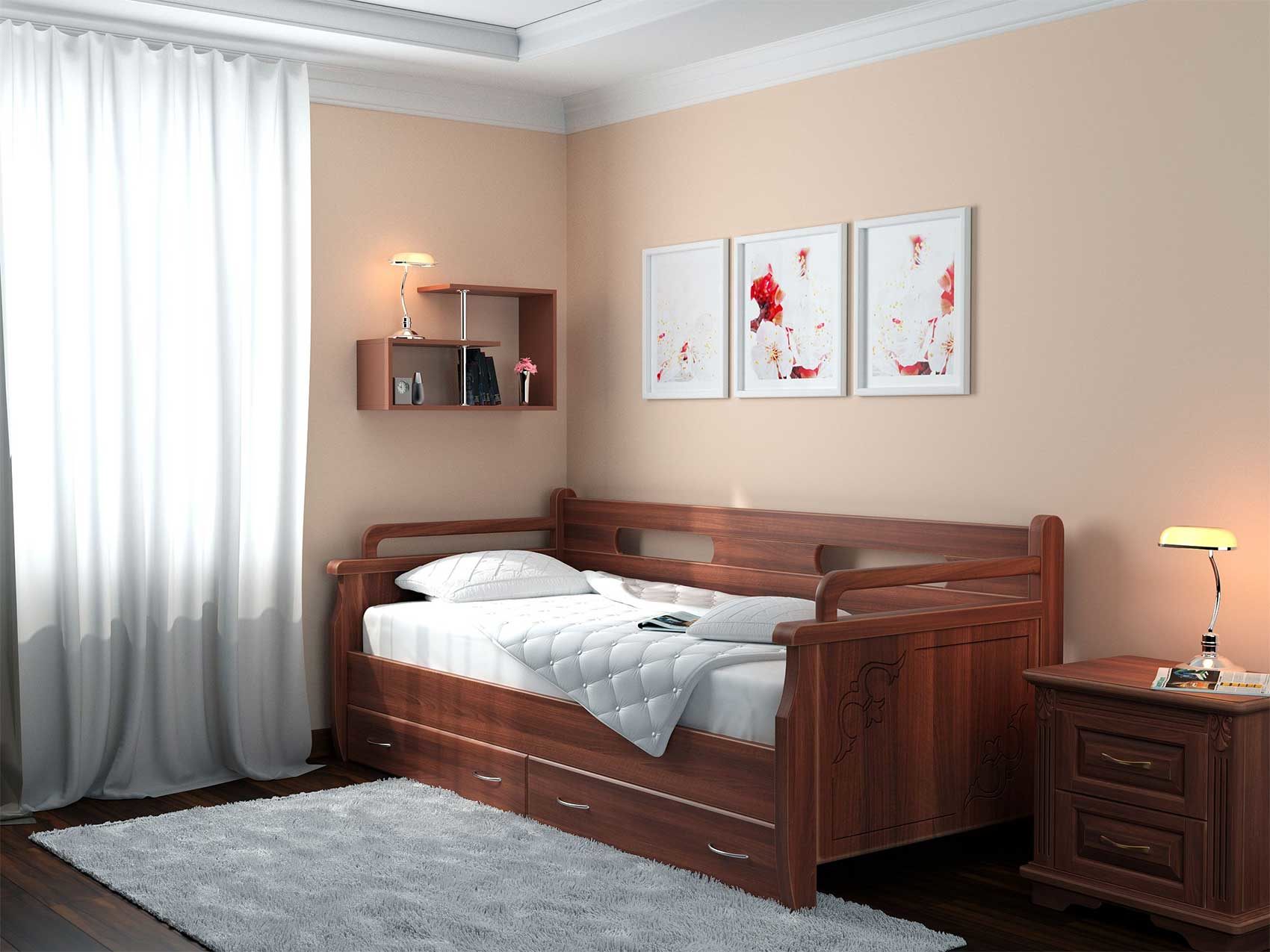 Живая классика для Вашего интерьера. Как и у всех моделей кроватей практичность и универсальность кровати, возможность комплектования как выкатными ящиками, так и ящиком для белья из массива или ЛДСП с подъемным механизмом фронтального или бокового открытия являются неоспоримыми преимуществами этой модели. Стандартно не комплектуется выкатными ящиками, ящики заказываются и оплачиваются отдельно. Задняя спинка — 85 см., боковые поручни — 75 см.
